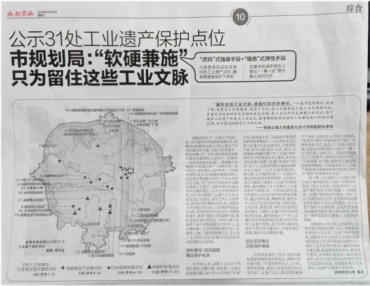 據成都商報2016年4月26日第十版訊,為了有針對性地保護成都珍貴的工業遺產,成都市規劃局通過對中心城區現存工業點位的梳理和評價,規劃推薦工業遺產點位共31處,其中已列入文保單位、優秀近現代建筑點位3處,保留原生產功能點位5處,已實現再利用點位8處,帶保護利用點位15處。
