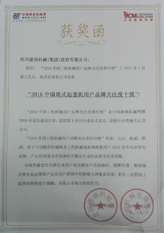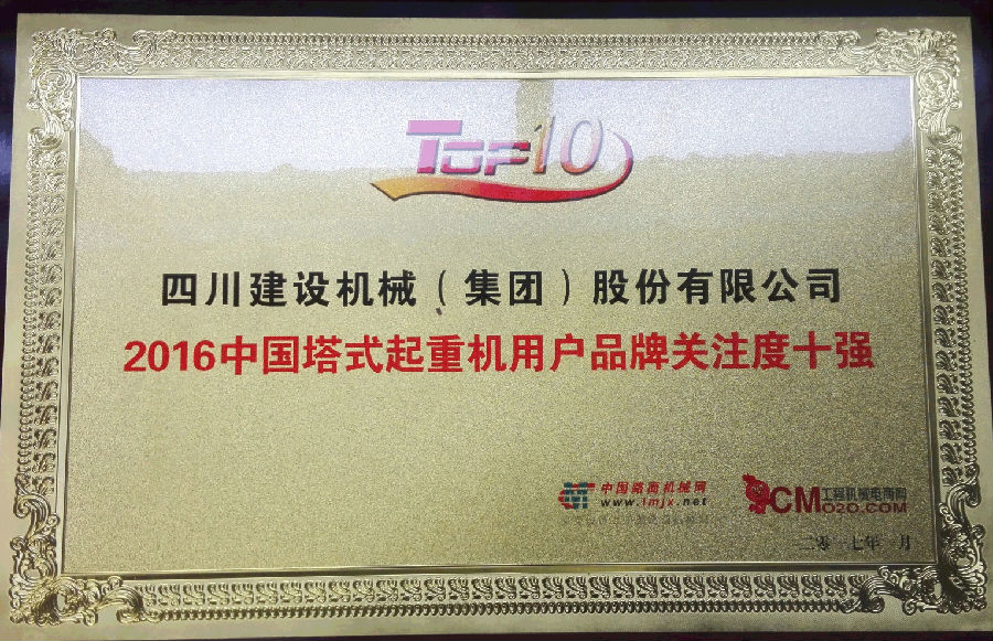 2017年1月3日,中國路面機械網和工程機械電商網在北京發布“2016中國塔式起重機用戶關注度排行榜”,四川建設機械(集團)股份有限公司進入“2016中國塔式起重機用戶品牌關注度排行榜”前十強,排名第二位。
